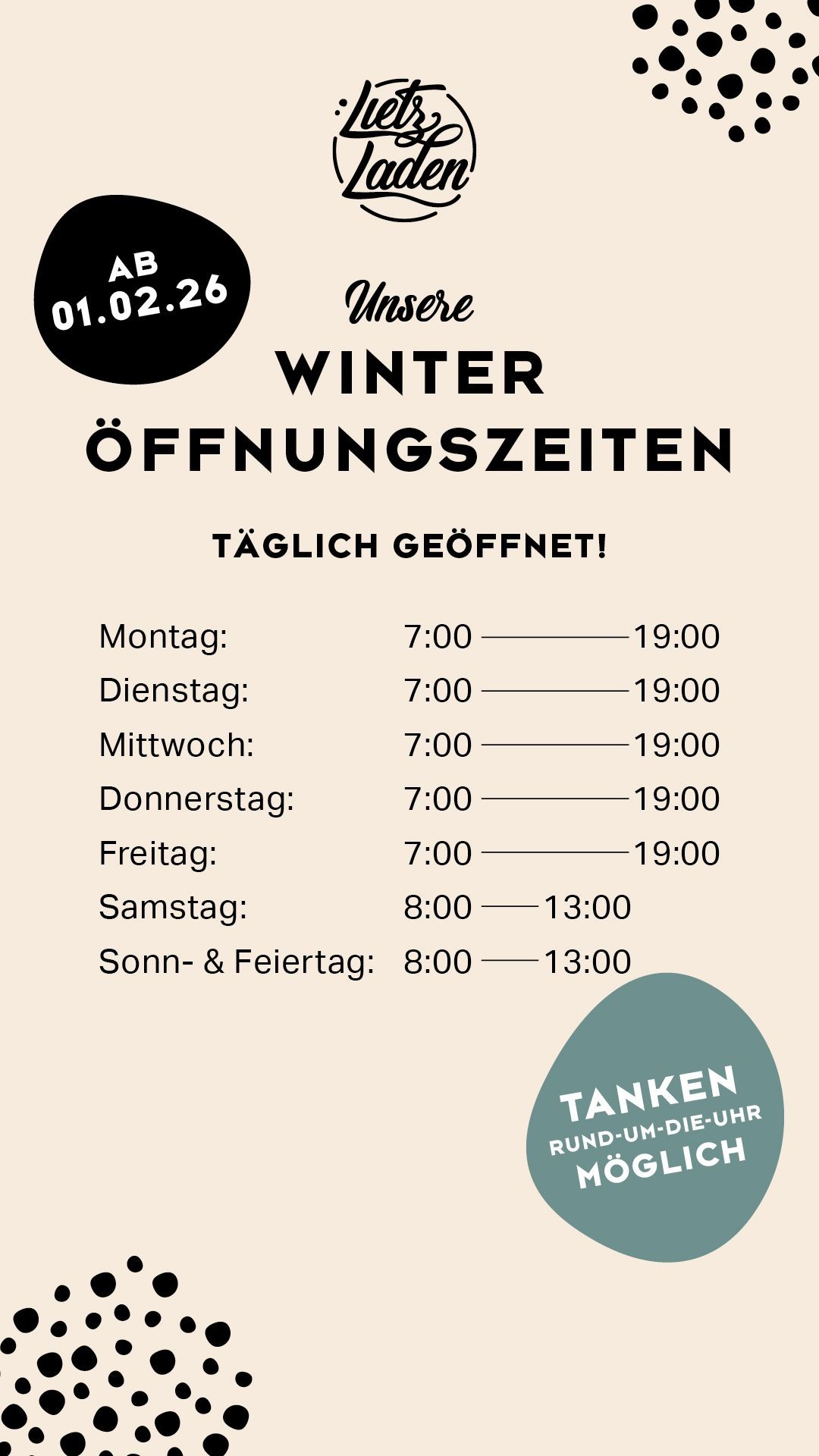 Sa, Sonn- und Feiertag 8.00 - 13.00 Uhr
