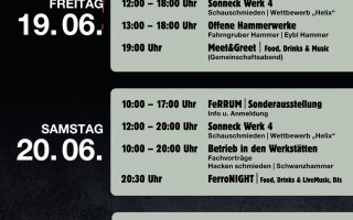 Danach erwartet die Besucherinnen und Besucher ein abwechslungsreiches Programm: Fachvorträge rund um das Schmiedehandwerk, Schmiedevorführungen am historischen Schwanzhammer, traditionelles Hacken schmieden sowie als besonderes Highlight die FerroNIGHT, ein energiegeladenes Rock-Event.