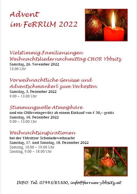 Am Samstag, 3. Dezember 2022 erwartet die Besucher vorweihnachtliche Genüsse & Adventschmankerl zum Verkosten. Der shopFeRRUM ist von 9.00 - 13.00 Uhr geöffnet.