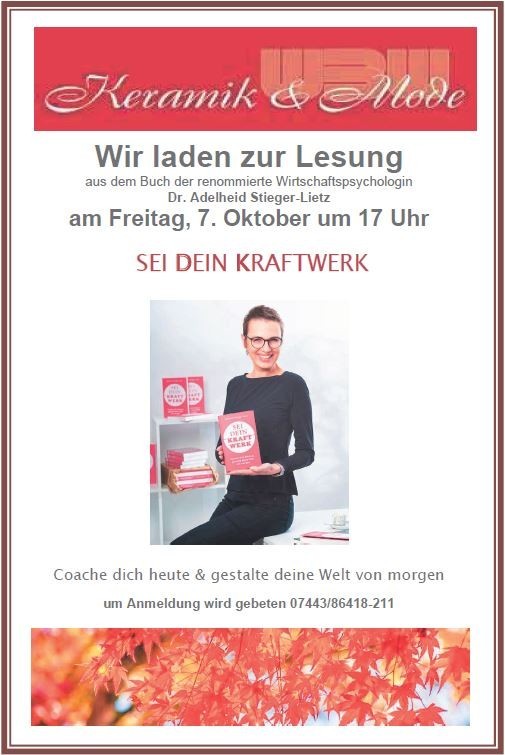 Das Offene Haus WBW lädt herzlich zur Buchlesung mit der renommierten Wirtschaftspsychologin Dr. Adelheid Stieger-Lietz am Freitag, 7. Oktober um 17.00 Uhr.
