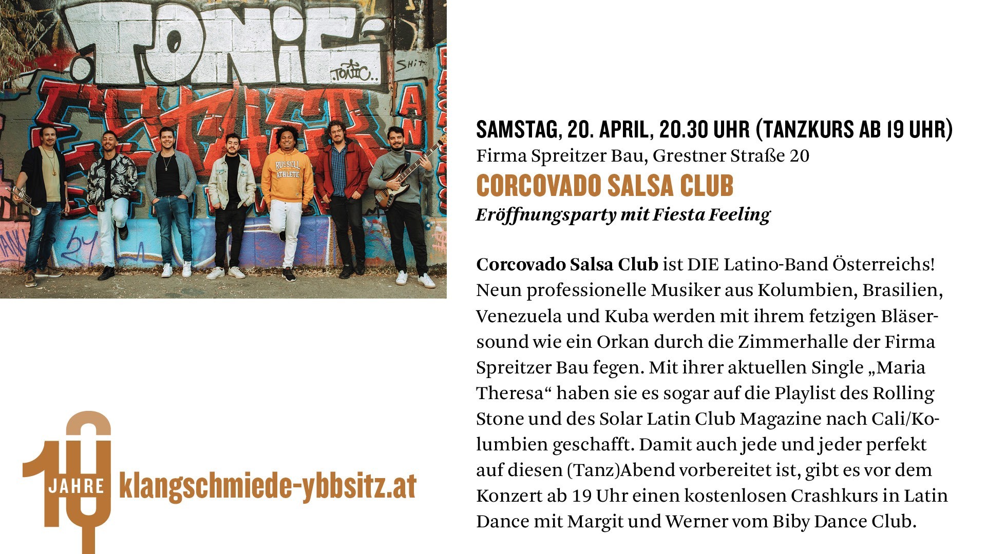 Corcovado Salsa Club ist DIE Latino-Band Österreichs! Neun professionelle Musiker aus Kolumbien, Brasilien, Venezuela und Kuba werden mit ihrem fetzigen Bläsersound wie ein Orkan durch die Zimmerhalle der Firma Spreitzer Bau fegen. Mit ihrer aktuellen Single „Maria Theresa“ haben sie es sogar auf die Playlist des Rolling Stone und des Solar Latin Club Magazine nach Cali/Kolumbien geschafft.