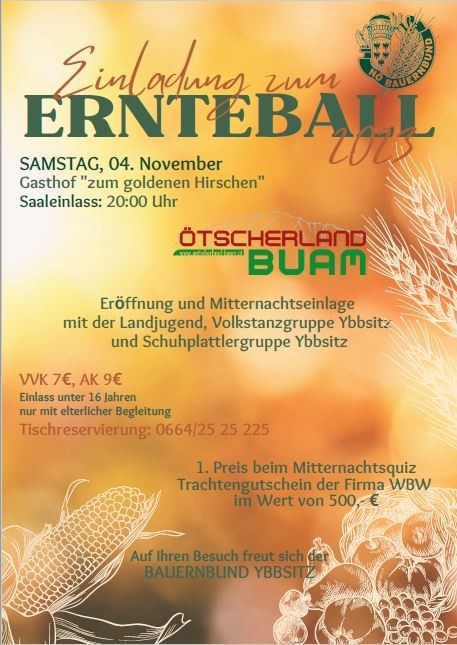 Der Bauernbund Ybbsitz lädt herzlich zum Ernteball 2023 ein!