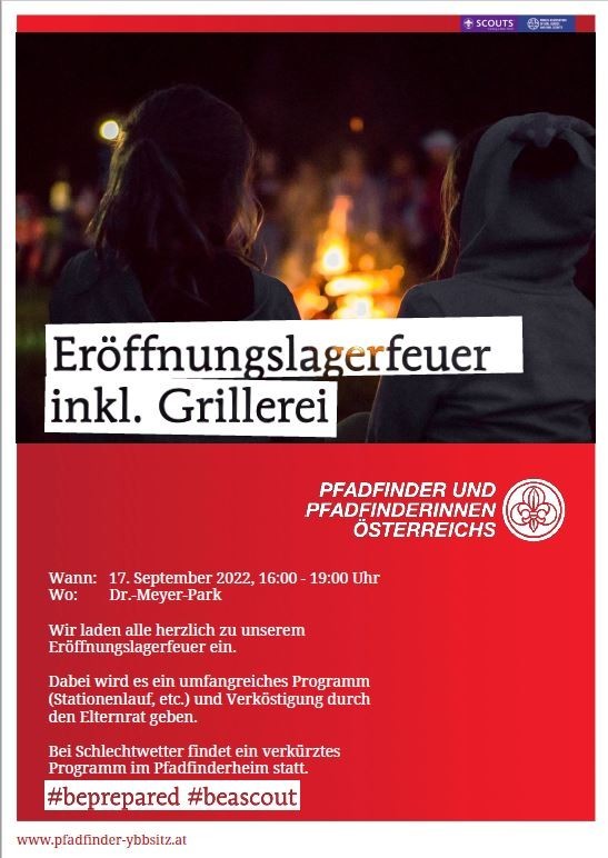Die Pfadfindergruppe lädt alle herzlich zum Eröffnungslagerfeuer inkl. Grillerei von 16.00 - 19.00 Uhr ein.
