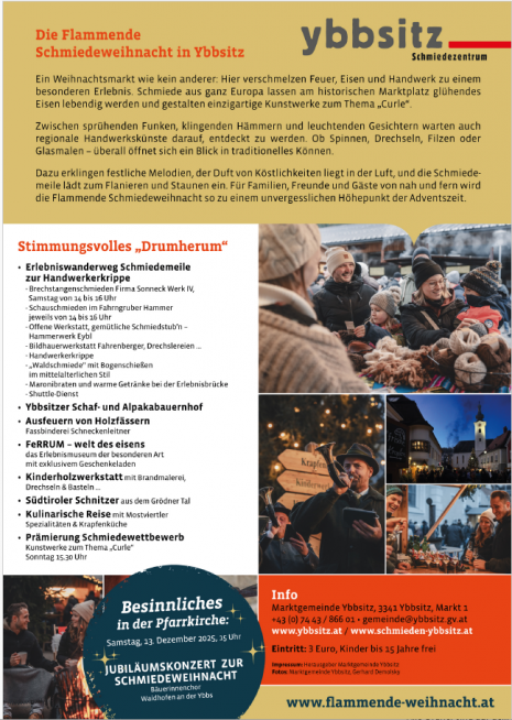 Dazu erklingen festliche Melodien, der Durft von Köstlichkeiten liegt in der Luft, und die Schmiedemeile lädt zum Flanieren und Staunen ein. Für Familien, Freunde und Gäste von nah und fern wird die Flammende Schmiedeweihnacht so zu einem unvergesslichen Höhenpunkt der Adventszeit.