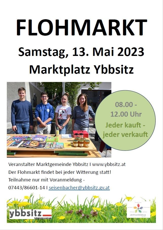 Die Marktgemeinde und der Verein Zentrumsbelebung laden wieder herzlich zum Frühlingsflohmarkt auf den Ybbsitzer Marktplatz von 8.00 - 12.00 Uhr unter dem Motto "Jeder kauft - jeder verkauft" ein!