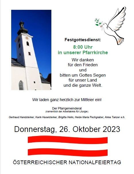 Die Pfarre Ybbsitz lädt zur Mitfeier des Festgottesdienstes am Nationalfeiertag um 8.00 Uhr in die Pfarrkirche ein!