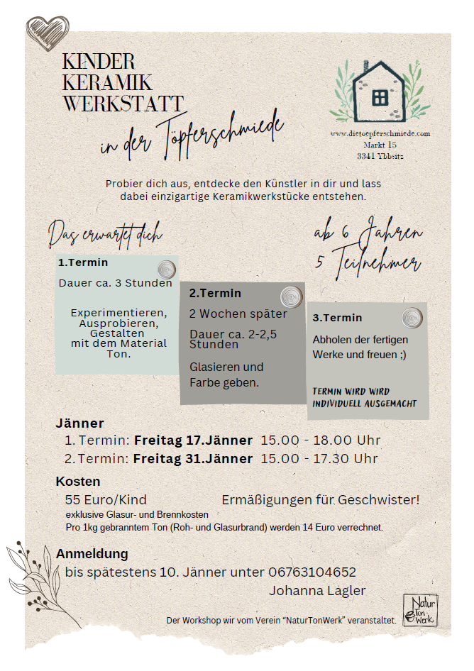 Kosten. € 55,-- / Kind exkl. Glasur- und Brennkosten. Ermäßigungen für Geschwister!