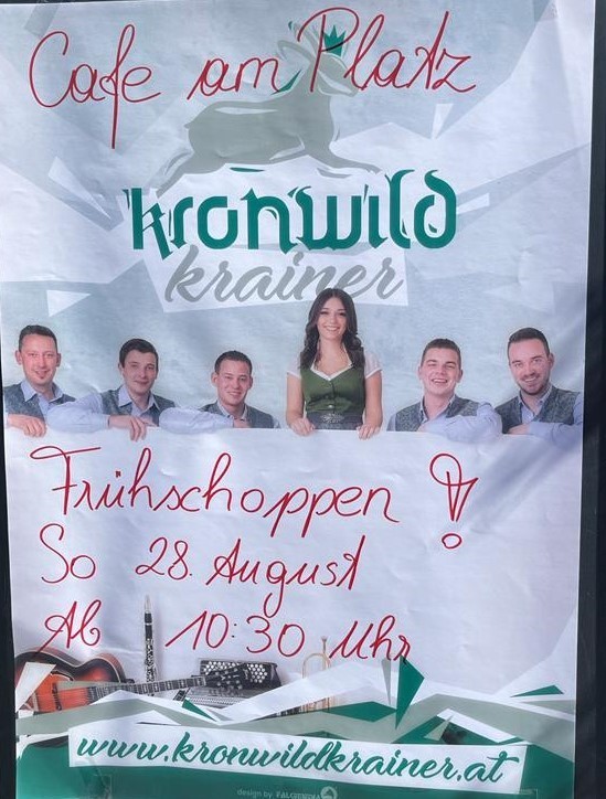 Aufgrund der Wettervorhersage für den heutigen Sonntag wird leider der Frühschoppen mit den Kronwildkrainern im Cafe am Platz absagt.