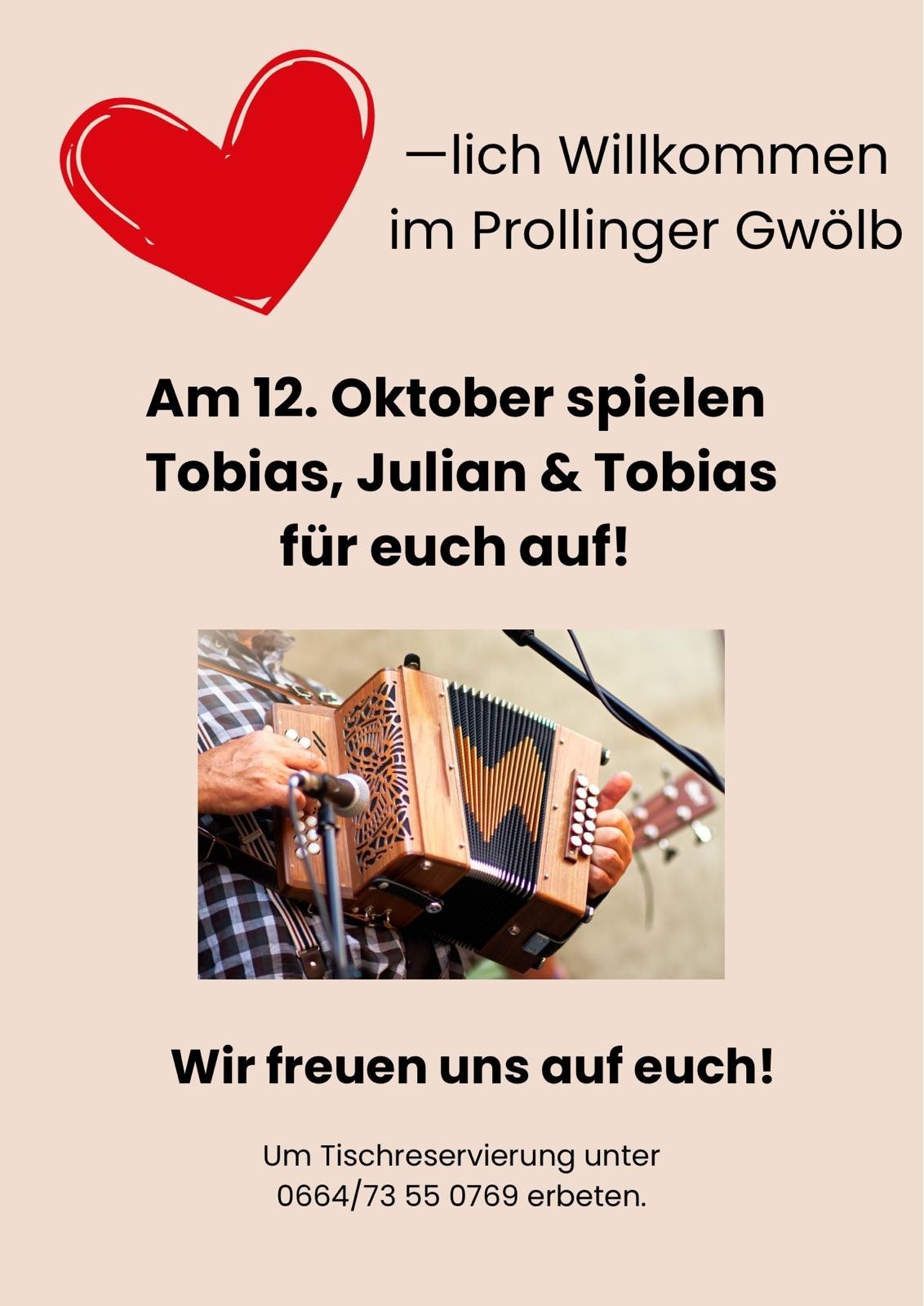 Sonntag, 12. Oktober 2025 - ab 16.00 Uhr spielen Tobias, Julian & Tobias auf!
