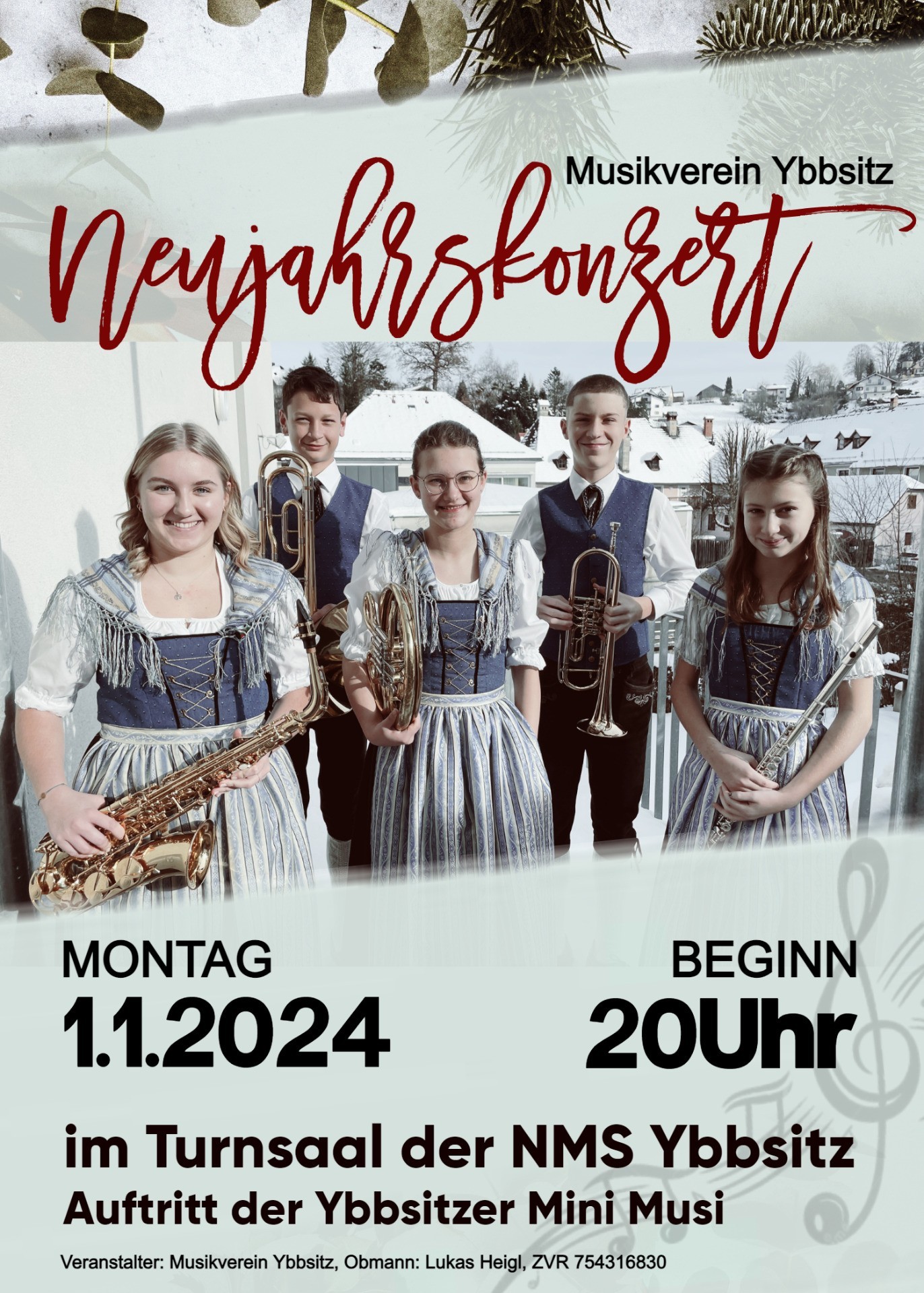 Der Musikverein Ybbsitz lädt herzlich zum alljährlichen Neujahrskonzert ein. Auch dieses Jahr wird ein abwechslungsreiches Programm unter der Leitung von Kapellmeister Christoph Fuchsluger zum Besten gegeben.