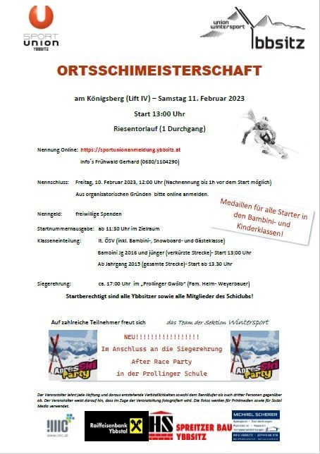 Die Sportunion - Wintersport lädt zu den Ybbsitzer Ortsschimeisterschaften am Samstag, 11. Februar 2023 am Königsberg (Lift IV) ein.