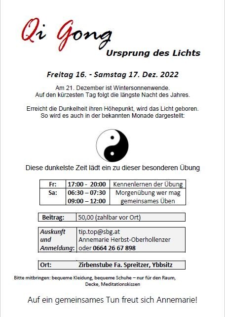 Aus diesem Grund lädt Annemarie Herbst-Oberhollenzer von 16. - 17. Dezember 2022 zur gemeinsamen Qi Gong Übung in die Zirbenstube ein!