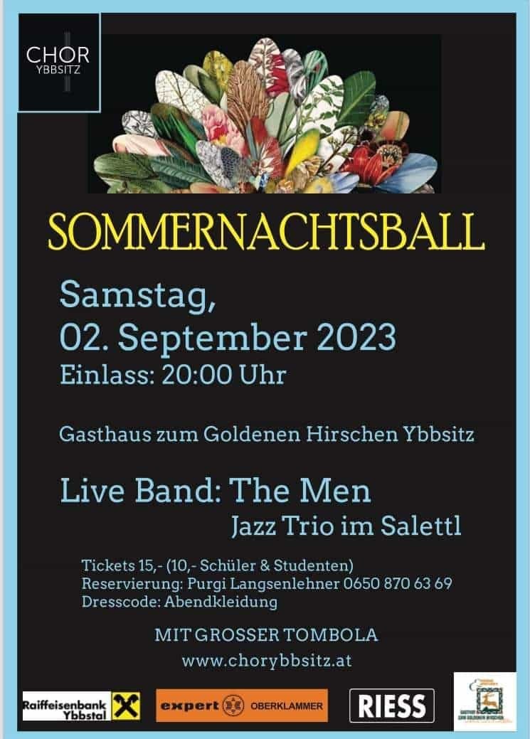Der CHOR Ybbsitz lädt herzlich zum Sommernachtsball am Samstag, 2. September 2023 in den Festsaal des Goldenen Hirschen herzlich ein!