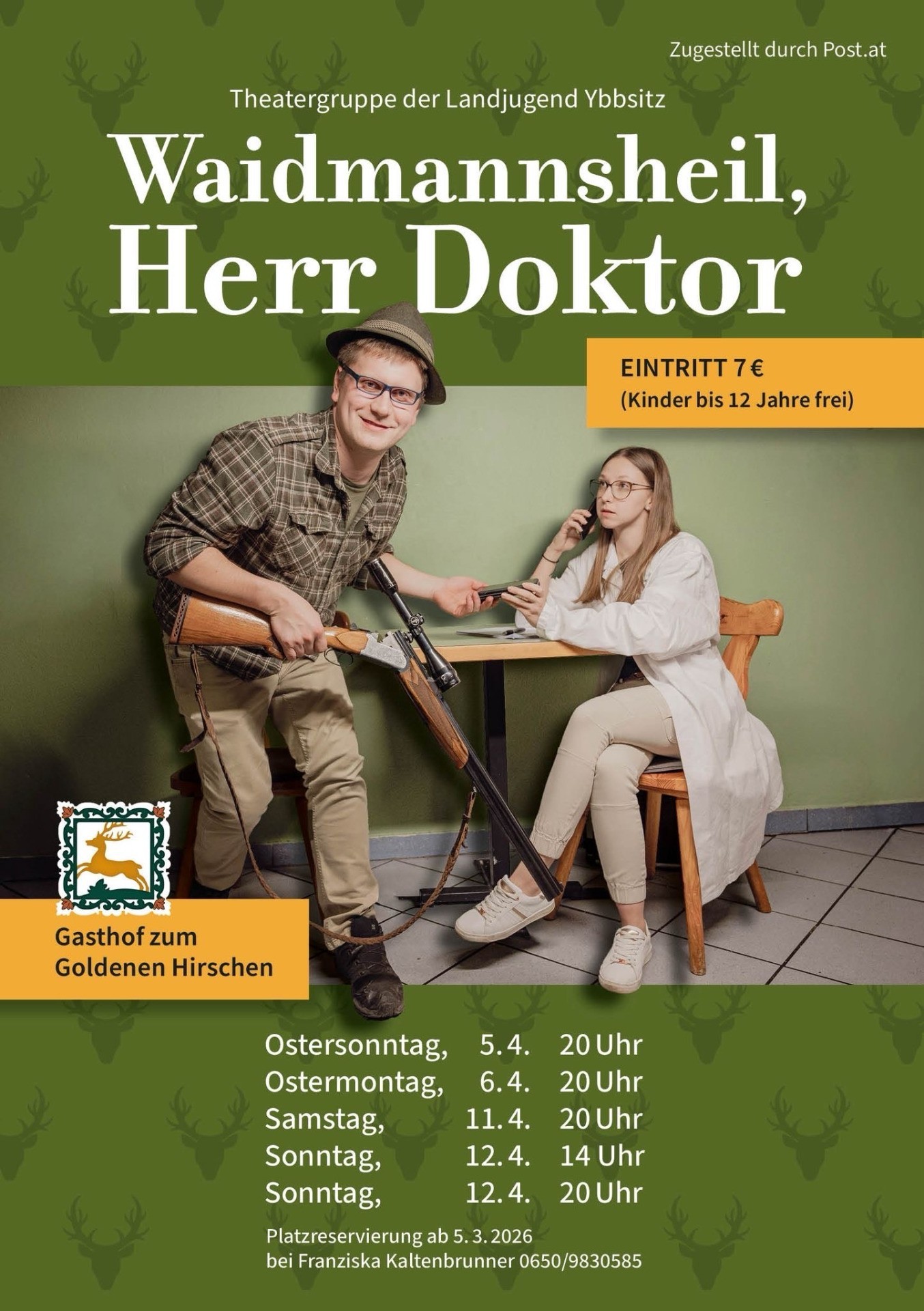 Die Theatergruppe der Landjugend Ybbsitz lädt herzlich zum Theaterstück "Waidmannsheil, Herr Doktor" im Gasthof Zum Goldenen Hirschen ein: