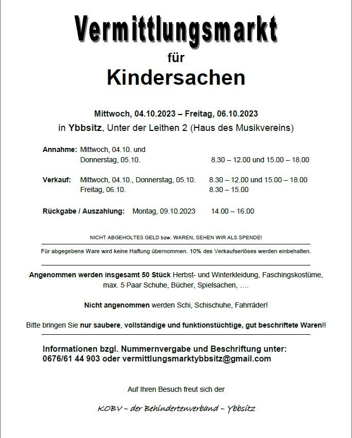 Das Helferteam vom KOBV Ybbsitz bietet von Mittwoch, 4. Oktober bis Freitag 6. Oktober 2023 den beliebten Vermittlungsmarkt für Kindersachen an.
