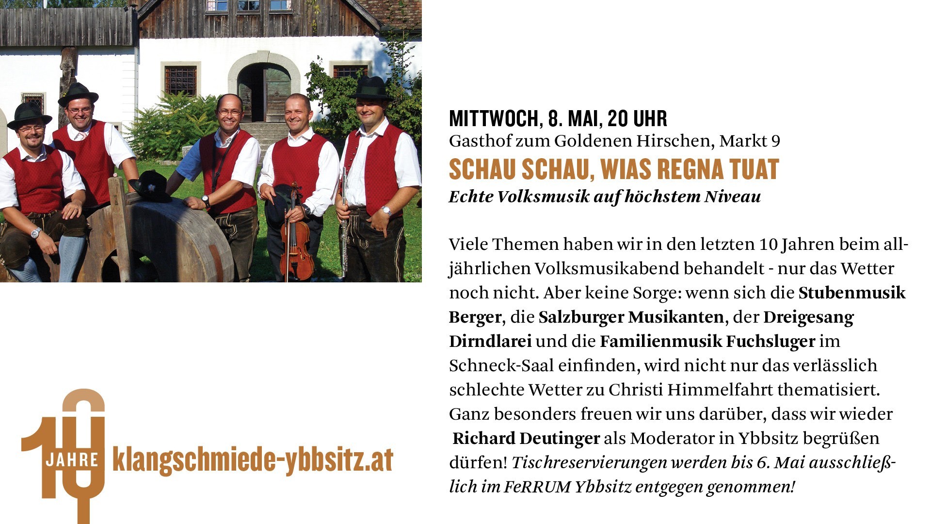 Viele Themen haben wir in den letzten 10 Jahren beim alljährlichen Volksmusikabend behandelt - nur das Wetter noch nicht. Aber keine Sorge: wenn sich die Stubenmusik Berger, die Salzburger Musikanten, der Dreigesang Dirndlarei und die Familienmusik Fuchsluger im Schneck-Saal einfinden, wird nicht nur das verlässlich schlechte Wetter zu Christi Himmelfahrt thematisiert. Wir freuen wir uns sehr, dass wir wieder Richard Deutinger als Moderator in Ybbsitz begrüßen dürfen!