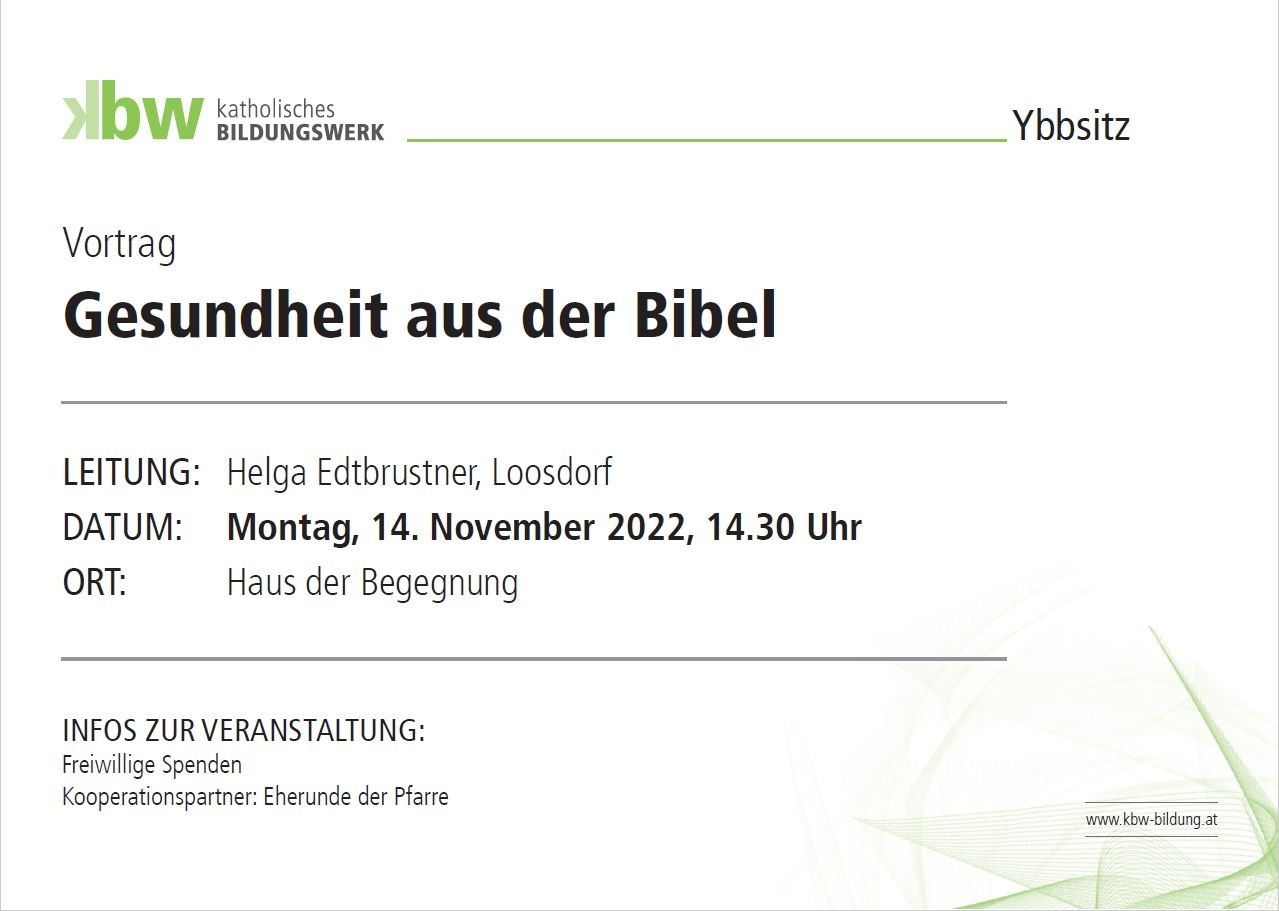 Es geht an diesem Nachmittag weniger um medizinische Ratschläge oder Rezepte, auch nicht um Hoch-Theologisches, sondern vielmehr um Lebenspraktisches, das die Bibel mit ihrer jahrtausendealten Geschichte uns auch heute noch sagen kann – Gesundheitstipps für Leib, Geist und Seele. Es geht einfach um den ganzen Menschen, um Grundhaltungen und Wege zu einem erfüllten Leben!