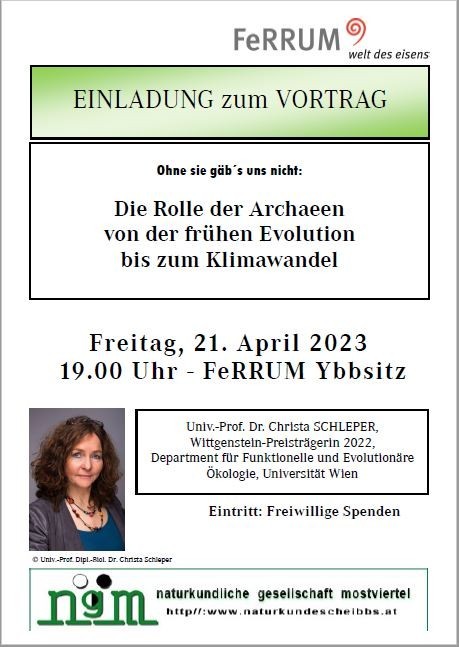 Die Naturkundliche Gesellschaft Mostviertel hat in ihrem Jahresprogramm 2023 wieder zahlreiche Vorträge aus dem weiten Bereich der organismischen Naturkunde ausgewählt. Im Rahmen des Bildungsangebotes "Fridays for Nature" findet auch ein Vortrag in Ybbsitz im Haus FeRRUM statt: